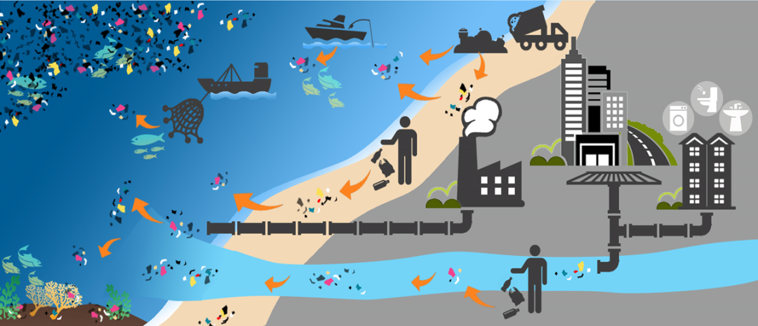 海洋垃圾的來(lái)源包括:沿海居民生活垃圾,內(nèi)陸居民扔入市政污水系統(tǒng)的微塑料,海邊游客留下的垃圾,工廠排放入河流、大海的垃圾,漁業(yè)垃圾,海上游輪或作業(yè)船產(chǎn)生的垃圾。