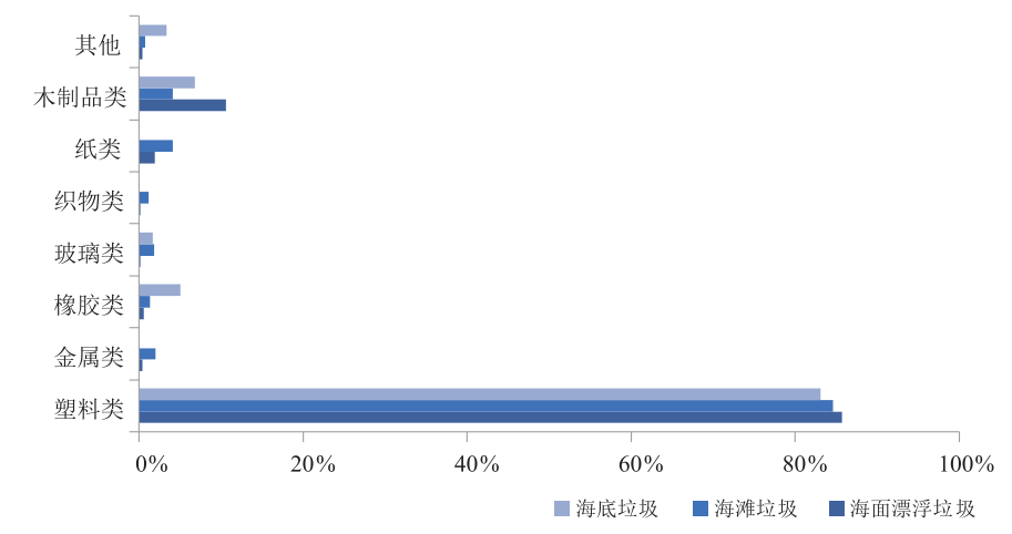 中華人民共和國(guó)生態(tài)環(huán)境部2020年發(fā)布的《中國(guó)海洋生態(tài)環(huán)境狀況公報(bào)》顯示,在對(duì)全國(guó)49個(gè)區(qū)域開(kāi)展了海面、海灘以及海底垃圾調(diào)查后,發(fā)現(xiàn)其中塑料類(lèi)占比最高,超過(guò)80%。金屬、玻璃、織物,紙張等常見(jiàn)的垃圾類(lèi)別占比均低于10%。
